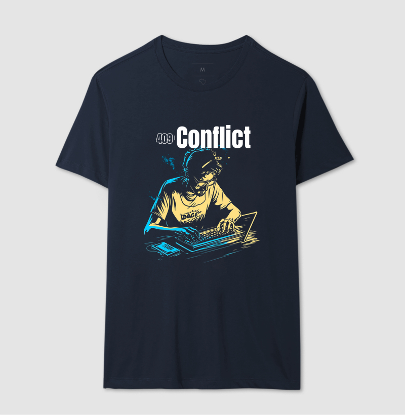 “409: Conflict” — Quando duas mudanças entram em choque e o sistema não sabe o que fazer. Seja um *merge conflict*, um deploy problemático ou um impasse no time de devs, esse erro representa o caos inevitável da programação. Ideal para desenvolvedores, DevOps e todos que já sofreram tentando resolver um conflito de código antes do prazo final. Vista essa referência tech e mostre que, na T.I., o verdadeiro desafio é evitar os conflitos antes que eles cheguem em produção.