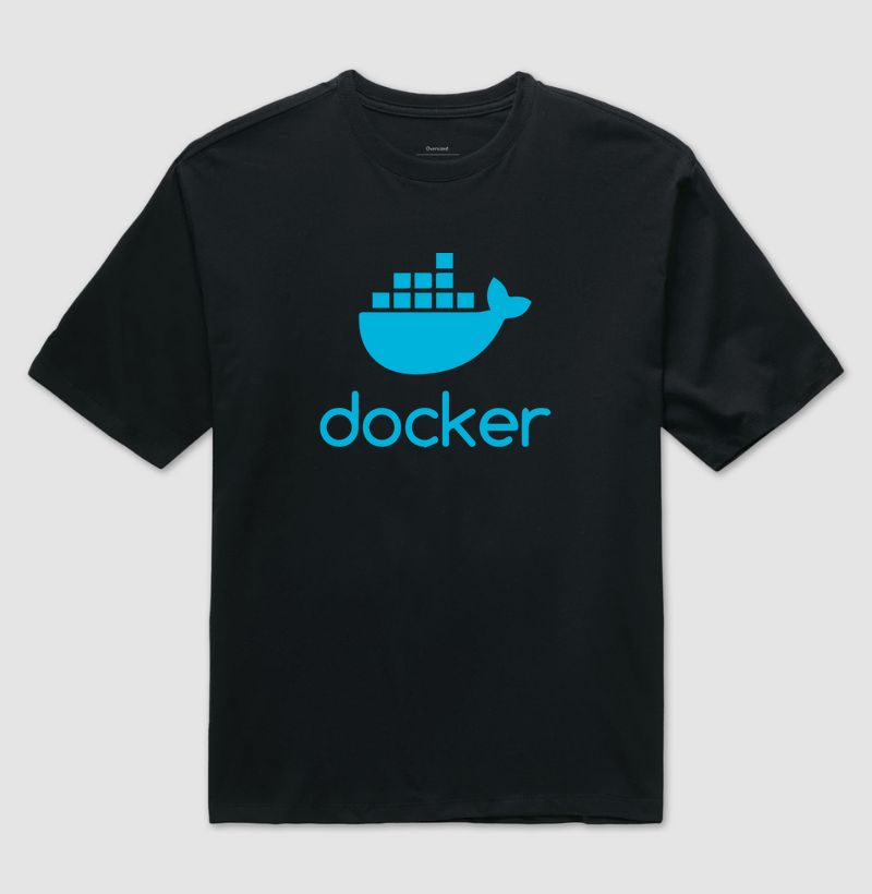 Um container, milhares de possibilidades. O logo azul do Docker representa muito mais do que orquestrar aplicações — é sobre empacotar ideias, mover estruturas e tornar o impossível escalável. Essa estampa é pra quem entende que hoje, construir sistemas é como navegar em mares digitais: leve, modular e infinito.