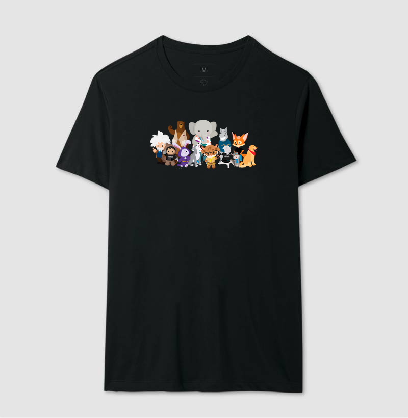 A equipe completa do Salesforce em uma única estampa! Astro, Codey, Cloudy e Einstein reunidos para representar o espírito de inovação, aprendizado e transformação digital que move o ecossistema da plataforma. Se você vive o mundo Salesforce e domina desde o Trailhead até as automações mais complexas, essa camiseta é para você. Vista essa referência e mostre que você faz parte da revolução na nuvem!