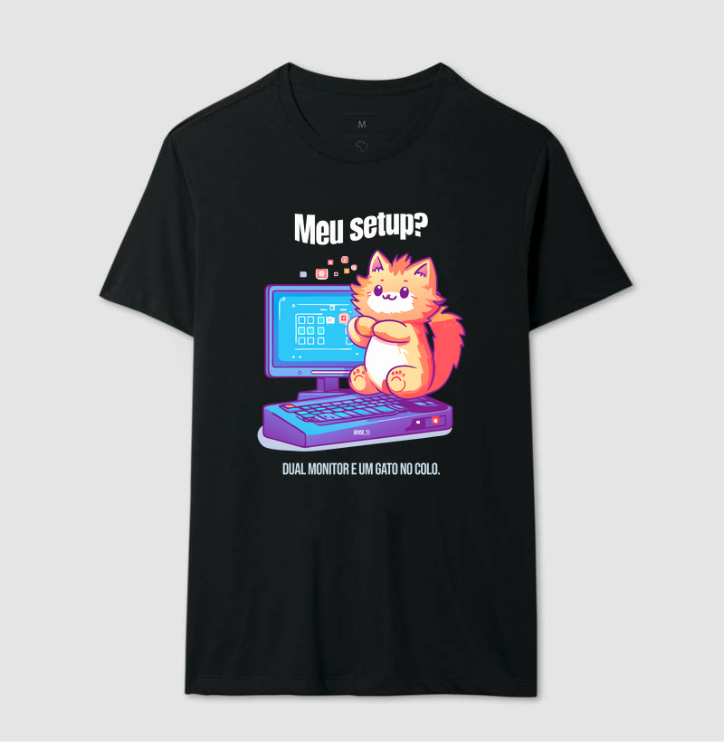 “Meu setup? Dual monitor e um gato no colo.” — A estampa perfeita para devs e amantes de tecnologia que sabem que produtividade de verdade inclui o combo ideal: código na tela e um gato no colo. Esta peça minimalista une o mundo da T.I. com o charme felino, celebrando o equilíbrio entre *debugging* e ronronadas. Ideal para quem trabalha de casa e tem o melhor assistente de todos — de quatro patas. Vista o conforto do seu home office e mostre que o verdadeiro *setup* é completo com um gato por perto.